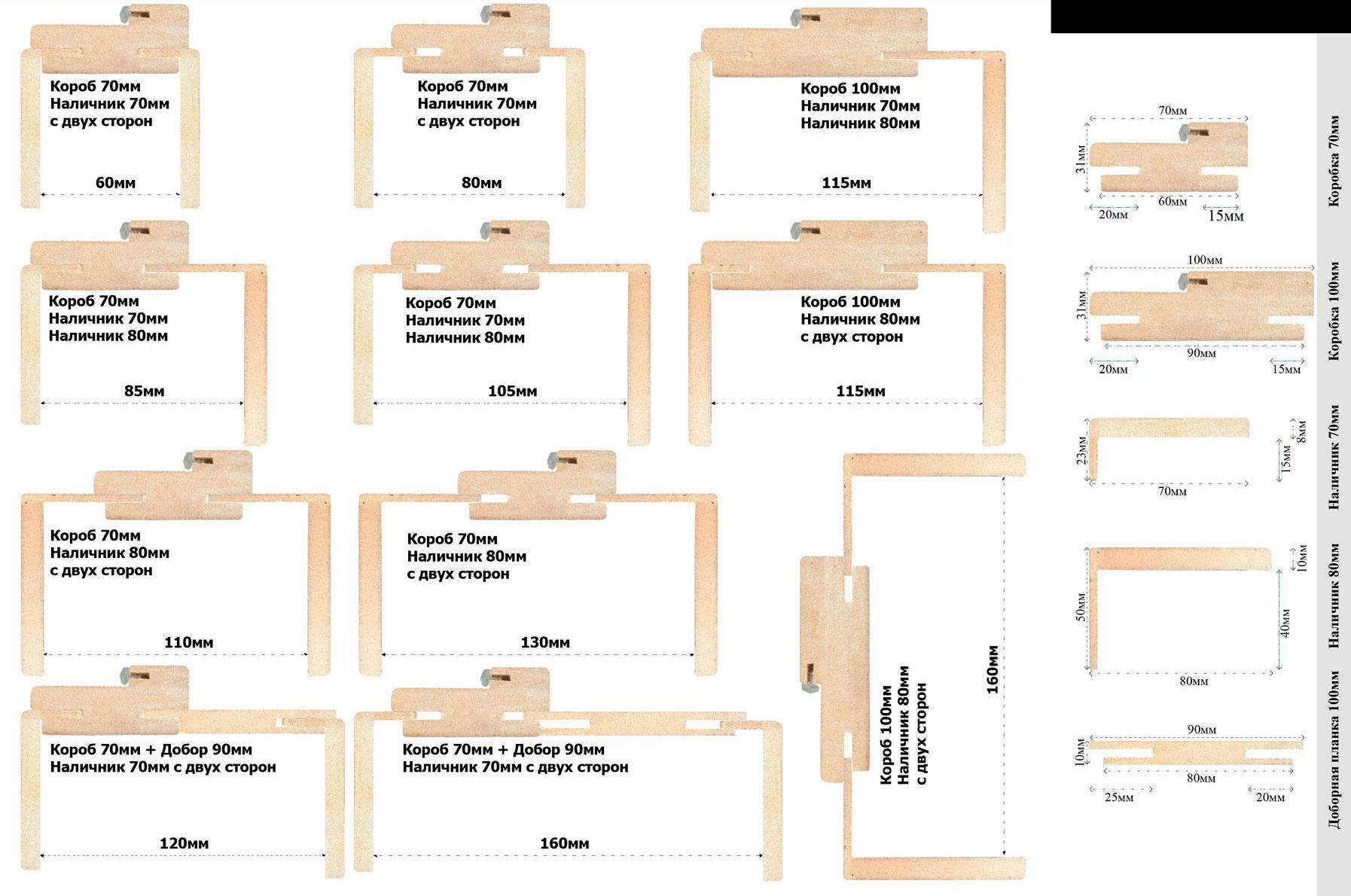 Возможна другая комплектация погонажем. В наличие есть дверная коробка телескоп 100 мм, наличник телескопический 80 мм, доборная планка 90 мм.Цены уточняйте